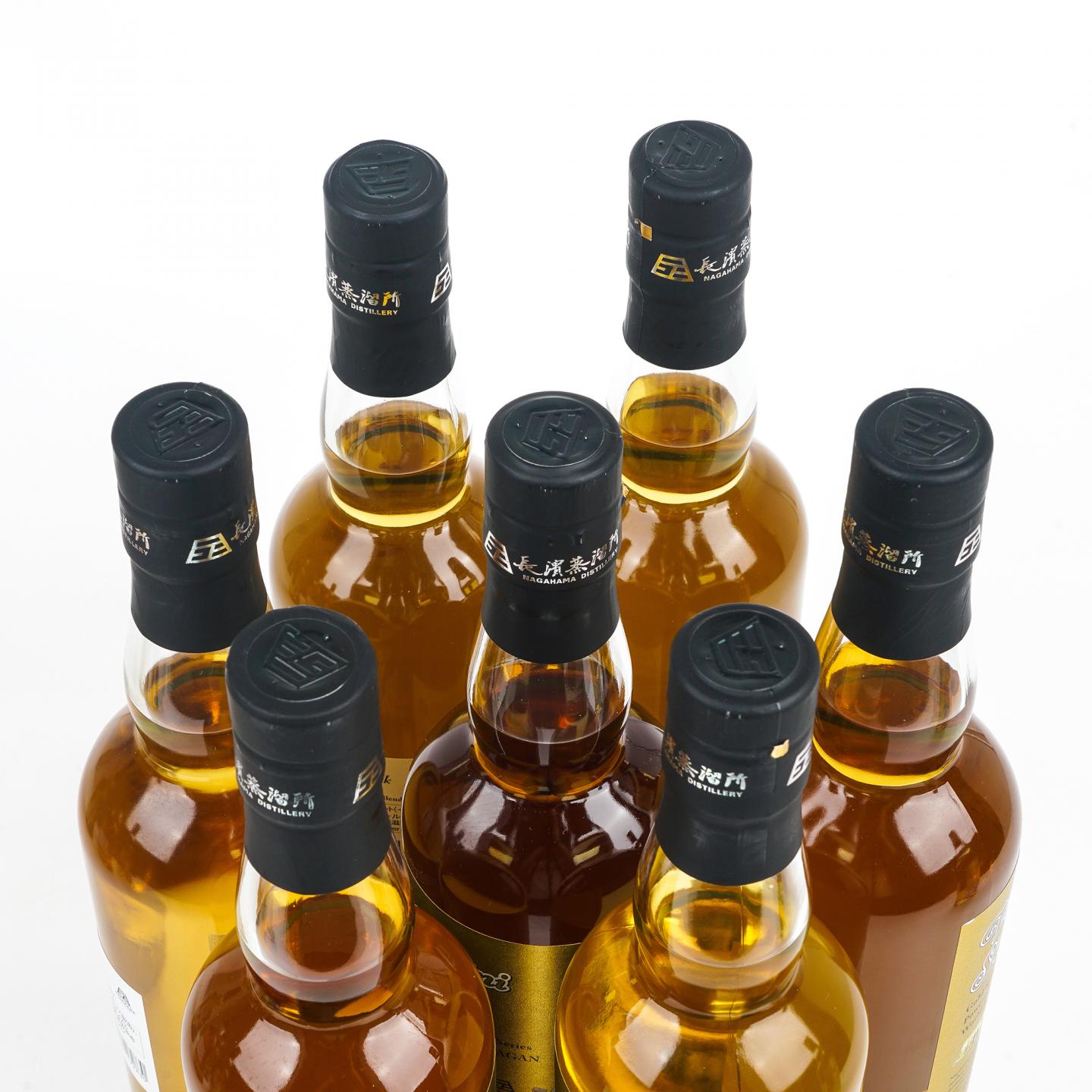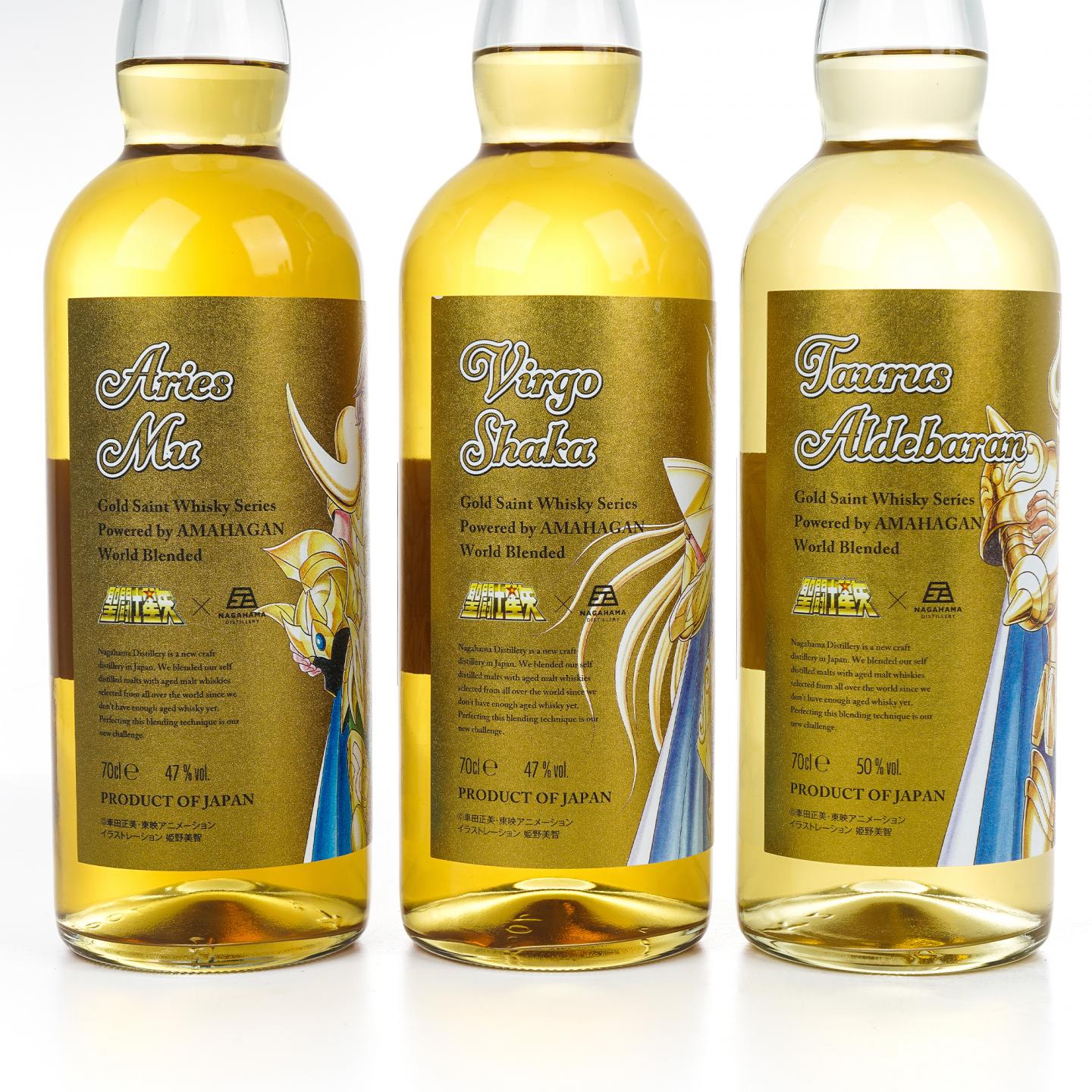 黄金圣斗士,是日本漫画家车田正美代表作《圣斗士星矢》漫画中女神雅典娜的最高级别圣斗士,立于八十八星座的顶点,他们身穿黄金圣衣,守护着通往雅典娜所在神殿的黄道圣域十二宫。2022年11月22日,长滨与圣斗士版权方东映动画(東映アニメーション株式会社)合作,推出了一个全新的黄金圣斗士威士忌系列。本套12瓶为黄金圣斗士威士忌系列套装,酒精度均为47%ABV,成套上拍,值得收藏。详情如下——1.首款酒——射手座Aiolos,于2022年11月22日发布,是一款无年份、无酒龄威士忌。酒厂并未明确说明这款酒所使用的原酒具体比例,只介绍说这是一款调和威士忌,其中含有长滨自家蒸馏的麦芽威士忌,以及从日本以外采购的麦芽和谷物威士忌,并且含有熟成时间长达30年的麦芽威士忌,装瓶数为3000瓶。2.系列第二款酒——摩羯座修罗Shura,于2022年12月20日发布,是一款无年份、无酒龄调和威士忌。酒厂并未明确说明这款酒所使用的原酒具体来源,只是说其主要原料为英国产麦芽,装瓶数为3000瓶。3.系列第三款酒——水瓶座卡谬Camus,于2023年01月17日发布,是一款无年份、无酒龄调和威士忌。长滨并未明确说明这款酒所使用的原酒具体来源,装瓶数为3000瓶。4.系列第四款酒——双鱼座阿布罗狄Aphrodite,于2023年02月14日发布,是一款无年份、无酒龄调和威士忌。长滨并未明确说明这款酒所使用的原酒具体来源,装瓶数为3000瓶。5.系列第五款酒——白羊座穆先生Mu,于2023年04月11日开始在日本上市开售,酒厂并未明确说明这款酒所使用的原酒具体来源,是一款无年份、无酒龄的调和威士忌。装瓶数为3000瓶。6.系列第六款酒——金牛座阿鲁迪巴Aldebaran,于2023年04月18日发布,是一款无年份、无酒龄调和威士忌。长滨并未明确说明这款酒所使用的原酒具体来源,装瓶数为3000瓶。7.系列第七款酒——双子座撒加Saga,于2023年05月23日发布,是一款无年份、无酒龄调和威士忌。长滨并未明确说明这款酒所使用的原酒具体来源,装瓶数为3500瓶。8.系列第八款酒——巨蟹座迪斯马斯克Deathmask,于2023年06月20日发布,是一款无年份、无酒龄调和威士忌。长滨并未明确说明这款酒所使用的原酒具体来源,装瓶数为3000瓶。9.系列第九款酒——狮子座艾欧里亚Aiolia,于2023年07月25日发布,是一款无年份、无酒龄调和威士忌。长滨并未明确说明这款酒所使用的原酒具体来源,装瓶数为3000瓶。10.系列第十款酒——处女座沙加Shaka,于2023 年9月19日起于日本电商网站「长浜浪漫ビール」 开卖。是一款无年份、无酒龄调和威士忌。长滨并未明确说明这款酒所使用的原酒具体来源。11.系列第11款酒——天秤座童虎Dohko,于2023年08月22日发布,为了表示对童虎“老师”的尊敬,特意在这款酒中加入了代表东方禅味的水楢桶威士忌原酒,装瓶数为3000瓶。12.系列第12款酒——天蝎座米罗Milo,于2023年10月17日发布,为了契合米罗的必杀技“猩红毒针”,长滨在这款酒中加入了具有刺激辛味的雪莉桶威士忌原酒,装瓶数为3000瓶。