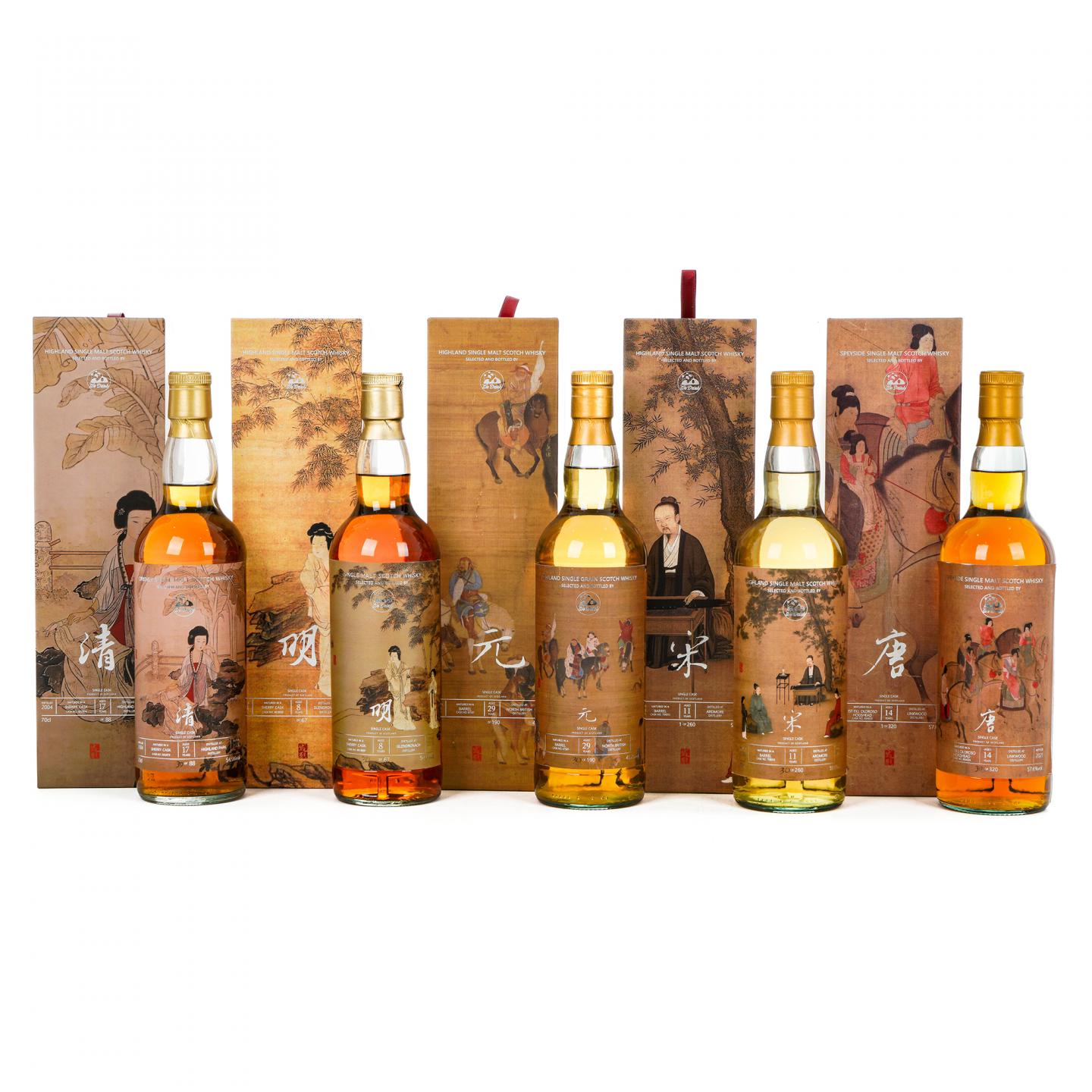 「盛世中国」系列单桶威士忌由威醺文化策划、选桶,均为苏格兰原装进口,坚持最为严格的“三不”标准:不冷凝处理、不着焦糖色、不加水稀释,全部以单桶桶强呈现,保证了威士忌的原厂风味。此系列单桶每一瓶都有独立编号,佐以精美的国风酒标,极赋东方韵味,是苏格兰威士忌和中国文化的完美融合。该系列单桶全套包含以下5支酒款:(1)林肯伍德 2007-2021,14年「唐」初填Oloroso雪莉桶单桶单一麦芽苏格兰威士忌,桶号#804324,酒精度57.6%,容量700ml,全球限定装瓶320瓶。酒标使用了唐代画家张萱的画作《虢国夫人游春图》,描绘了杨玉环的三姊虢国夫人及其眷从盛装出游、“道路为之耻骇”的盛况。《虢国夫人游春图》重人物内心刻画,浓艳而不失其秀雅,精工而不板滞。(2)阿德摩尔 2009-2021,11年「宋」橡木桶单桶单一麦芽苏格兰威士忌,桶号#709313,酒精度59%,容量700ml,全球限定装瓶260瓶。酒标使用了北宋宋徽宗赵佶的画作《听琴图》,此图绘松下抚琴赏曲的情景。画面正中一枝苍松,枝叶郁茂,凌霄花攀援而上,树旁翠竹数竿。松下抚琴人着道袍,轻拢慢捻,另二人坐于下首恭听,一侧身一仰面,神态恭谨。(3)北英 1992-2022,29年「元」橡木桶单桶单一谷物苏格兰威士忌,桶号#67501,酒精度45.2%,容量700ml,全球限定装瓶190瓶。酒标使用了元代画家刘贯道创作的《元世祖出猎图》,取材于元世祖行猎的场面,画中忽必烈着红衣白裘,乘着黑马。画中有十人,有弯弓搭箭,有驾鹰纵犬,人物分散,似做围猎状。(4)格兰多纳 2011-2019,8年「明」雪莉桶单桶单一麦芽苏格兰威士忌,桶号#9618959,酒精度54.1%,容量700ml,全球限定装瓶67瓶。酒标使用了明代吴门画派仇英的画作《修竹仕女图》,图中仕女宽袖长裙,于庭院中信步闲踱,凝视远方。画面工整纤丽,飘逸优雅,吸收了唐宋仕女画的技法。(5)高原骑士 2004-2021,17年「清」雪莉桶单桶单一麦芽苏格兰威士忌,桶号#5032979,酒精度54.9%,容量700ml,全球限定装瓶88瓶。酒标使用了清代画家吕彤的画作《蕉荫读书图》,图中绿蕉似盖,一女子坐于湖石之上读书,此画色彩极其清丽。