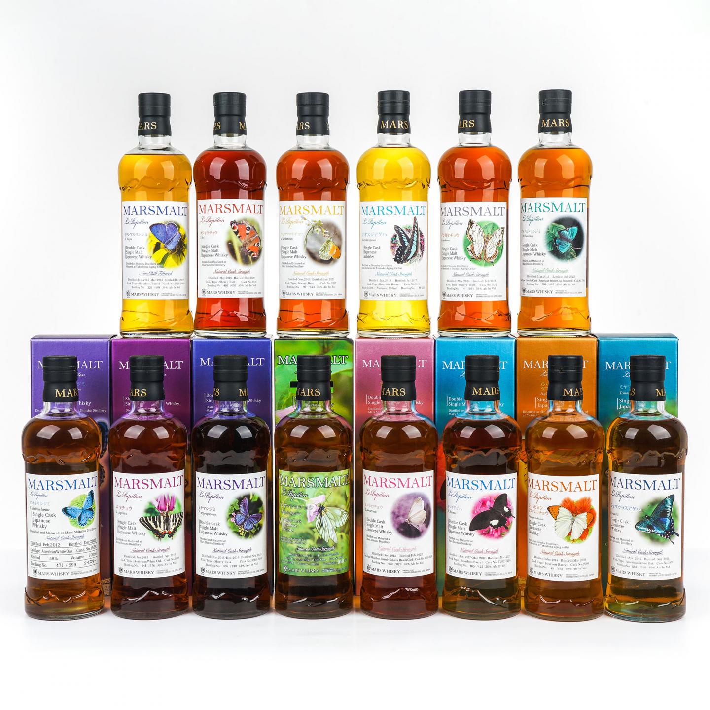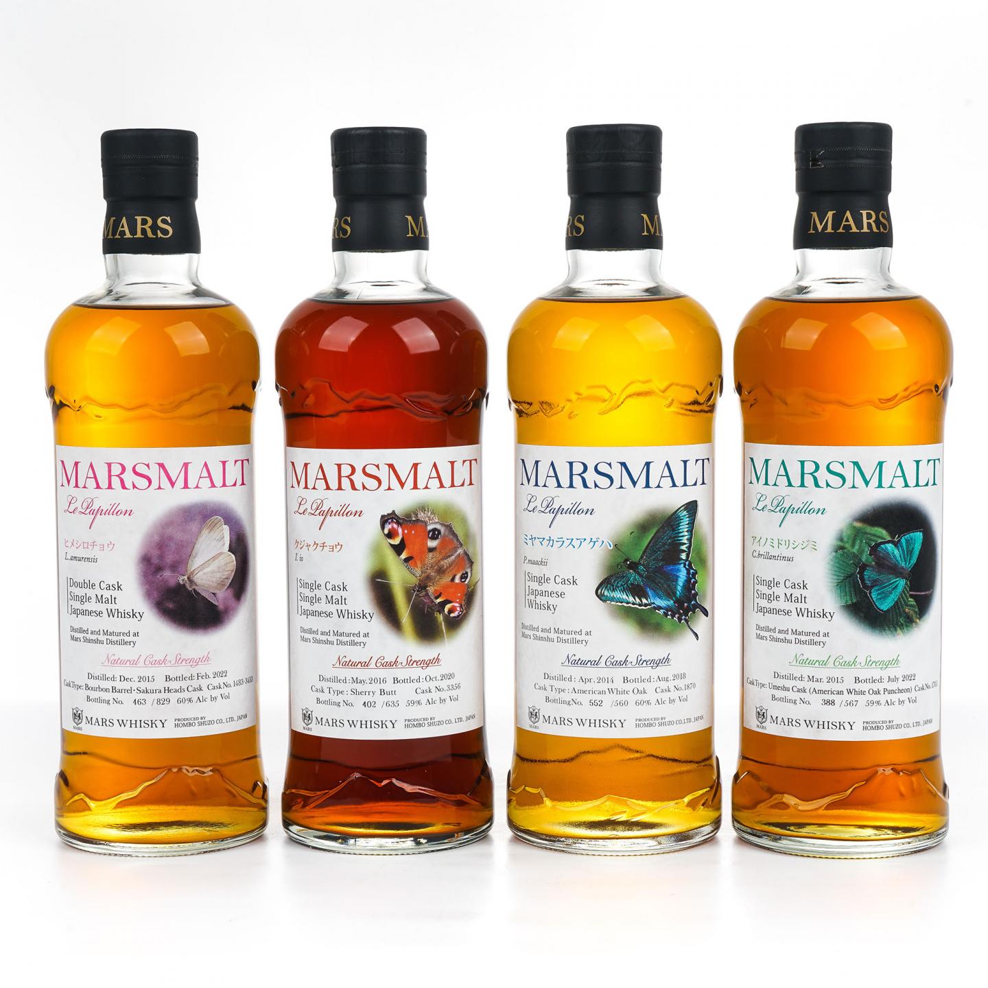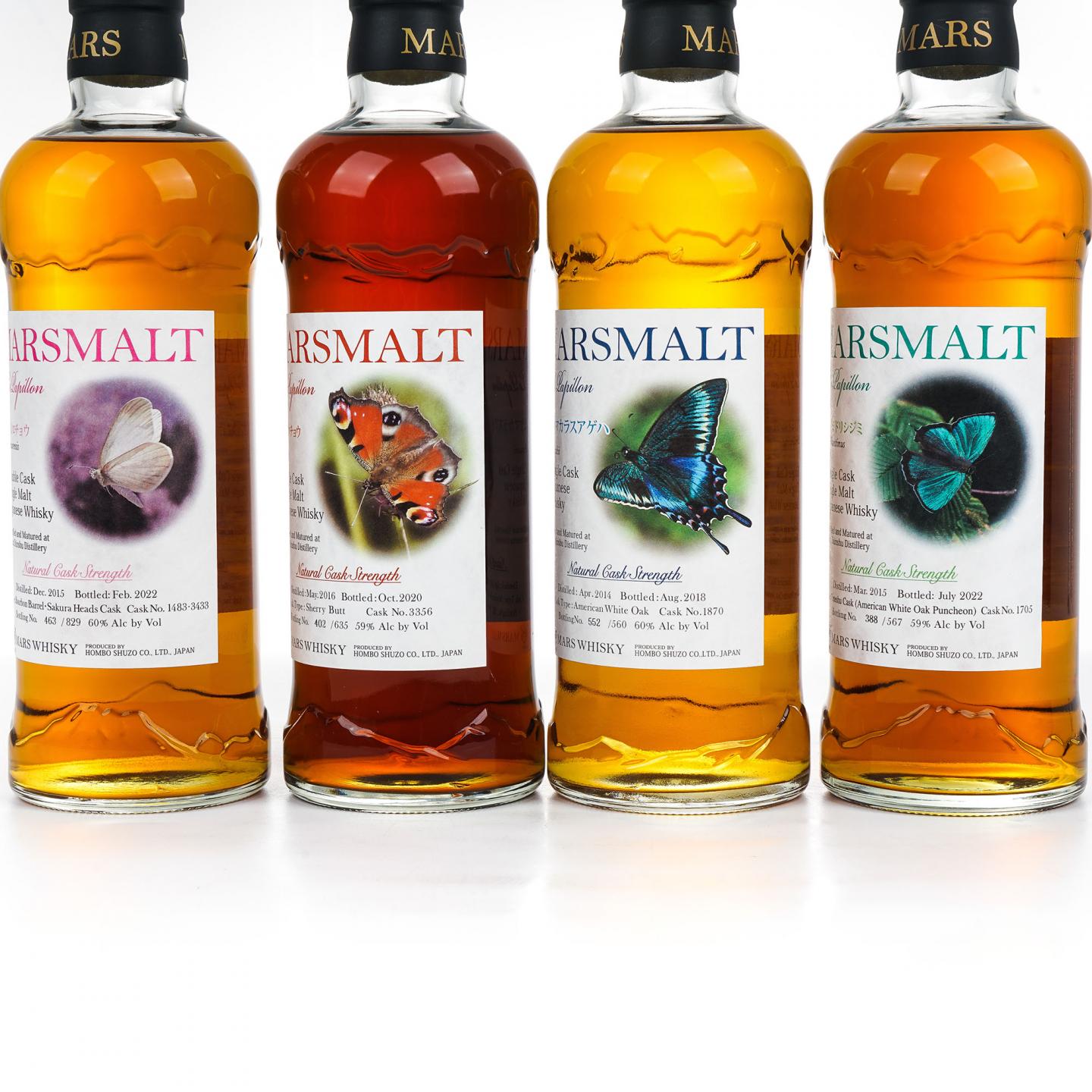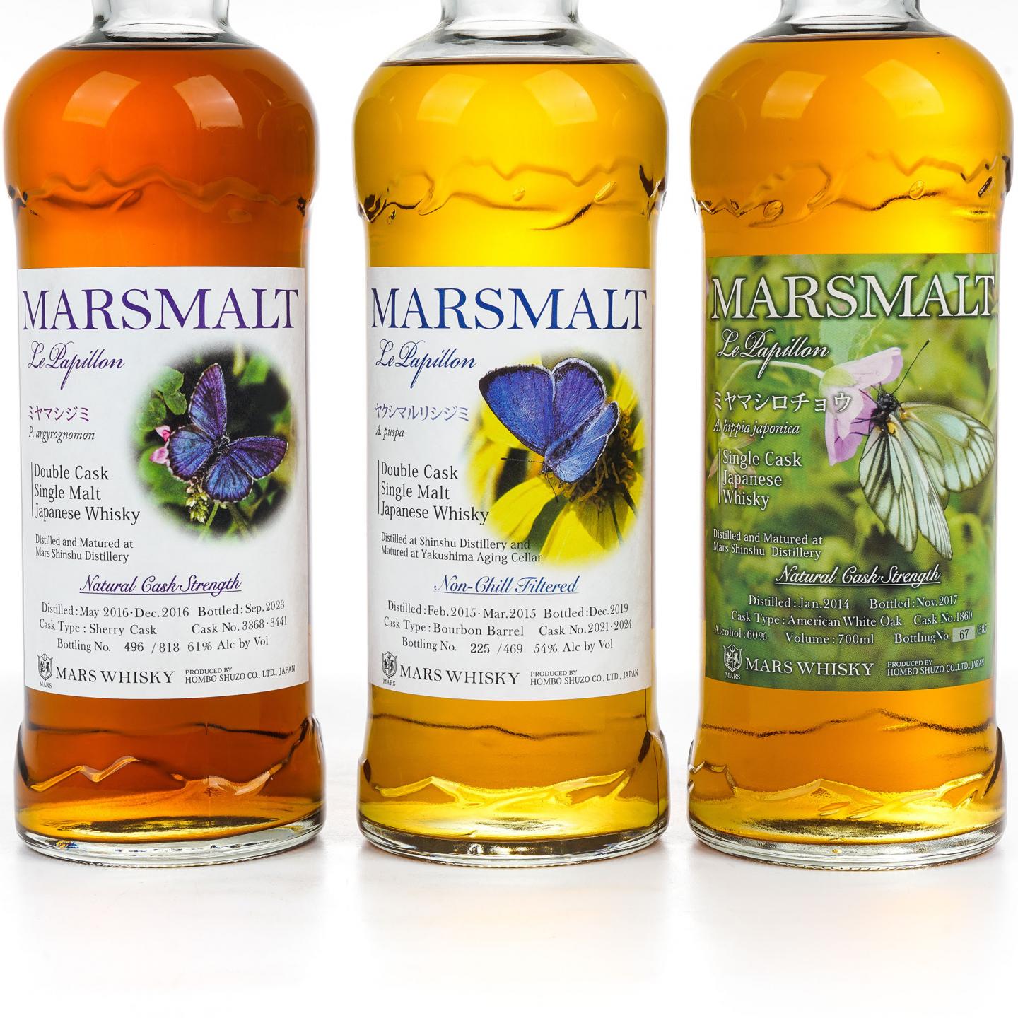 2017年,本坊酒造推出了一个名为蝴蝶(Le Papillon,法语蝴蝶的意思)的桶强单一麦芽威士忌系列(下称:蝴蝶系列)。这一系列的推出旨在向世人展示信州所在地——長野県良好的自然环境,以及当地具有代表性的自然物种——蝴蝶。截至2023年,本坊酒造在蝴蝶系列之下推出了14款酒,并且每款酒均以一个蝴蝶物种来命名(这些蝴蝶并不一定都生活在長野県)。本组14款美酒详情如下:1、大瑠璃小灰蝶:2012-2016,美国白橡木桶#1558,限量599瓶,58% Vol./700ml2、青凤蝶:2013-2017,波本桶#5111,限量215瓶,58% Vol./700ml3、深山白蝶:2014-2017,美国白橡木桶#1860,限量585瓶,60% Vol./700ml4、褄紅蝶:2014-2018,波本桶#2008,限量182瓶,60% Vol./700ml5、深山烏揚羽:2014-2018,美国白橡木桶#1870,限量560瓶,60% Vol./700ml6、石崖蝶:2015-2019,雪莉桶#5152,限量464瓶,58% Vol./700ml7、岐阜蝶:2013-2019,美国白橡木桶#1698,限量576瓶,58% Vol./700ml8、屋久島瑠璃小灰蝶:2015-2019,波本桶#2021/2024,限量469瓶,54% Vol./700ml9、雲間褄黄蝶:2015-2020,雪莉桶#3397,限量643瓶,58% Vol./700ml10、孔雀蝶:2016-2020,雪莉桶#3356,限量635瓶,59% Vol./700ml11、纹黄揚羽蝶:2017-2021,波本桶#T262/T284,限量422瓶,58% Vol./700ml12、绿小灰蝶(属小灰蝶科):2015-2022,美国白橡木桶#1705,限量567瓶,59% Vol./700ml13、白蝶:2015-2022,波本桶/Sakura Head桶#1483/3433,限量829瓶,60% Vol./700ml14、深山小灰蝶 :2016-2023,雪莉桶#3368/3441,限量818瓶,61% Vol./700ml