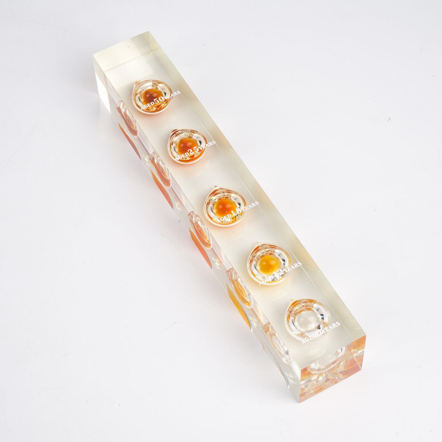 这是一款非常奇特的威士忌摆件,由日威著名品牌Yamazaki限量打造。其中由下到上,精选了山崎酒厂0年、12年、18年、25年、50年各个阶段的酒液。酒体色泽由浅到深,代表着岁月的流逝,暗示着风味的渐醇。这款摆件的精妙之处在于它是山崎酿酒厂的绝佳艺术,是时光的结晶。非常适合送礼或摆在家中欣赏,喜爱山崎的藏家们不可错过。