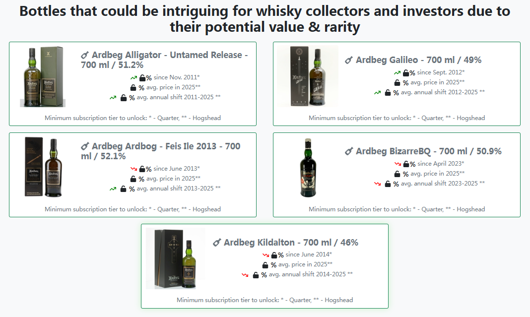 在whiskyhunter的网页上,根据珍稀度和价值潜力,罗列出了5支阿贝潜力股。它们隶属不同的系列,各具珍稀价值魅力,藏家们可加以特别的留意,如下图——