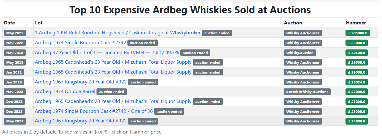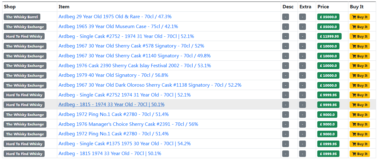 仍旧是著名威士忌分析网站whiskyhunter的统计,近些年在欧美各大拍卖行表现抢眼、价值突出的阿贝酒款如下——