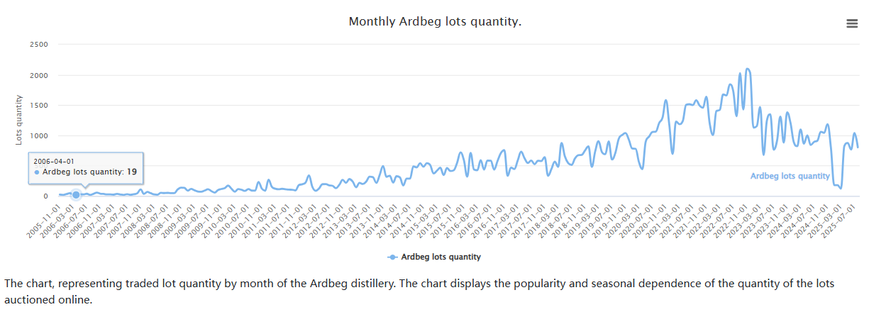 如下图,whiskyhunter统计了阿贝在欧美拍卖行的月度交易量走势,该数据于2022年11月达到巅峰期(2100件),此后在上上下下中曲折前行;今年3月份跌入谷底(122件),幸而下半年开启一波反弹,藏家们热情重燃——