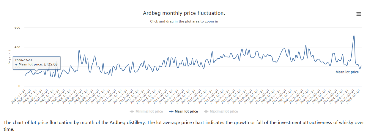 whiskyhunter统计了阿贝酒款在欧美拍卖行的月度均价走势,该数据于2025年3月达到巅峰期(约521英镑),与多数酒厂在今年处于低谷期的情况大相径庭,可谓是逆势闪光;此外,阿贝欧拍均价的一大亮点是:疫情至今虽然有起起伏伏,但整体水平保持相对稳定,价值坚挺如下图——