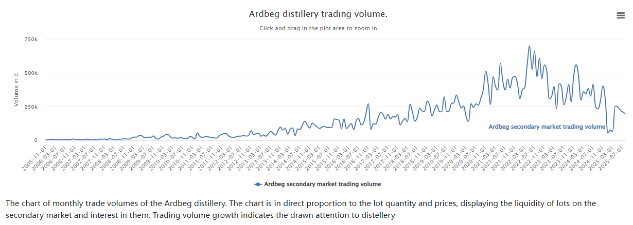 如下图,whiskyhunter统计了阿贝酒款在欧美拍卖行的月度交易额走势,该数据于2022年5月达到巅峰期(近80万英镑);此后在2023年12月创造出第二波小高峰(近56万英镑);至今年1月份跌入谷底(勉强5.3万英镑),二级市场信心亟待恢复——