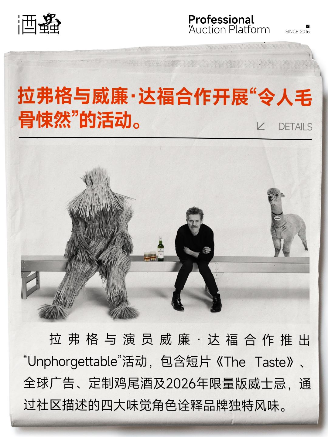 艾雷岛单一麦芽酿酒厂拉弗格与知名演员威廉·达福合作开展“Unphorgettable”活动。合作内容包括蒂姆·波普执导的短片《The Taste》、全球广告、定制鸡尾酒和计划于2026年发布的限量版威士忌。