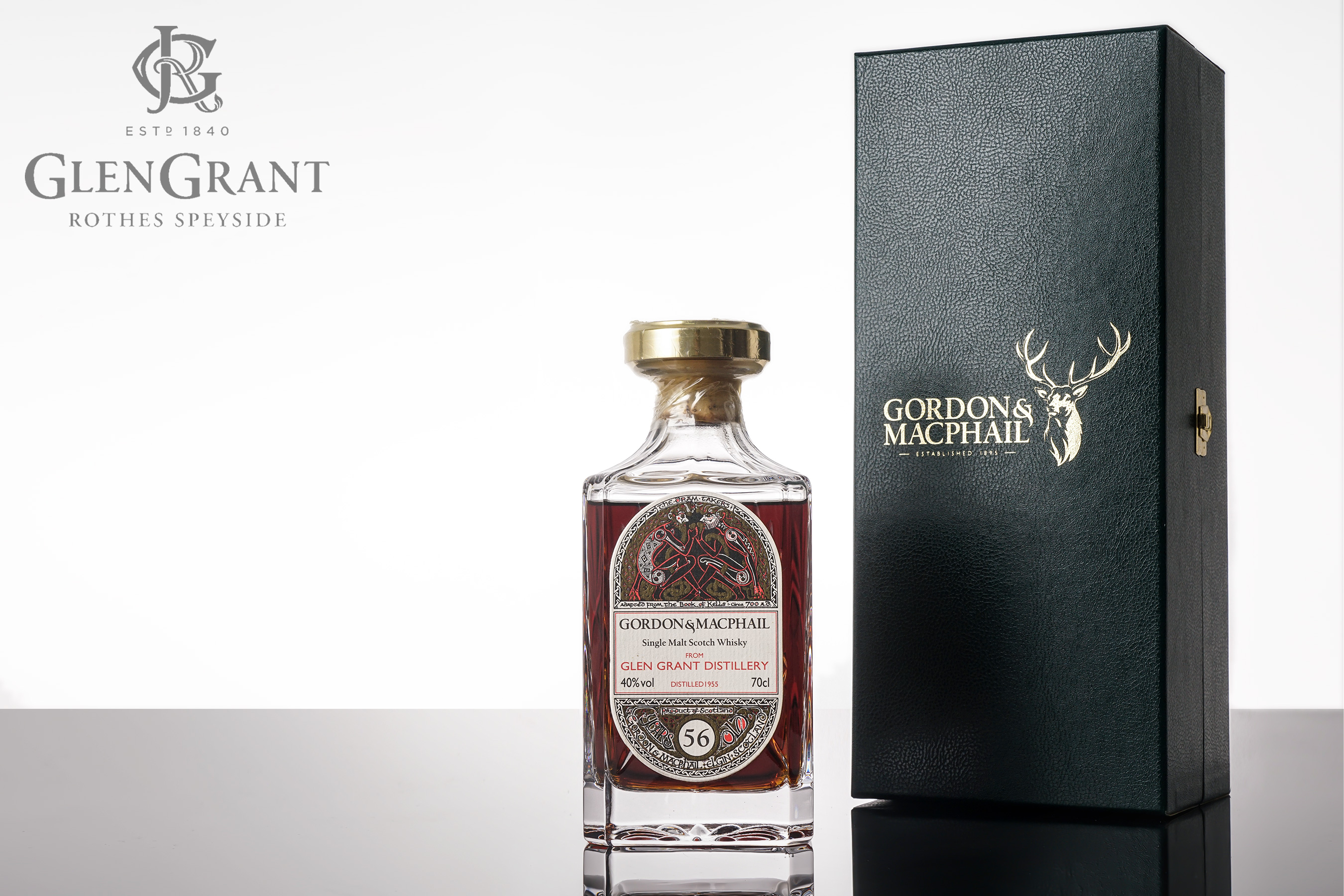 这瓶具有56年酒龄的格兰冠老酒,实属罕见。该酒蒸馏于久远的1955年,在酒厂严选的橡木桶中陈年,之后在Gordon & Macphail的仓库里熟成收尾,限量装瓶推出。酒精度为40%Vol.,酒色深邃迷人。搭配上精美的水晶瓶,以及凯尔经Book of Kells古典细致的插画酒标,包装设计典雅华贵,可谓是岁月与匠心的典范,堪称馈赠、收藏佳品。