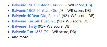 百富推出的海量美酒中,有多款在Whiskybase中获得颇高评分,非常值得重点关注。对此,whiskyhunter统计的榜单如下图——
