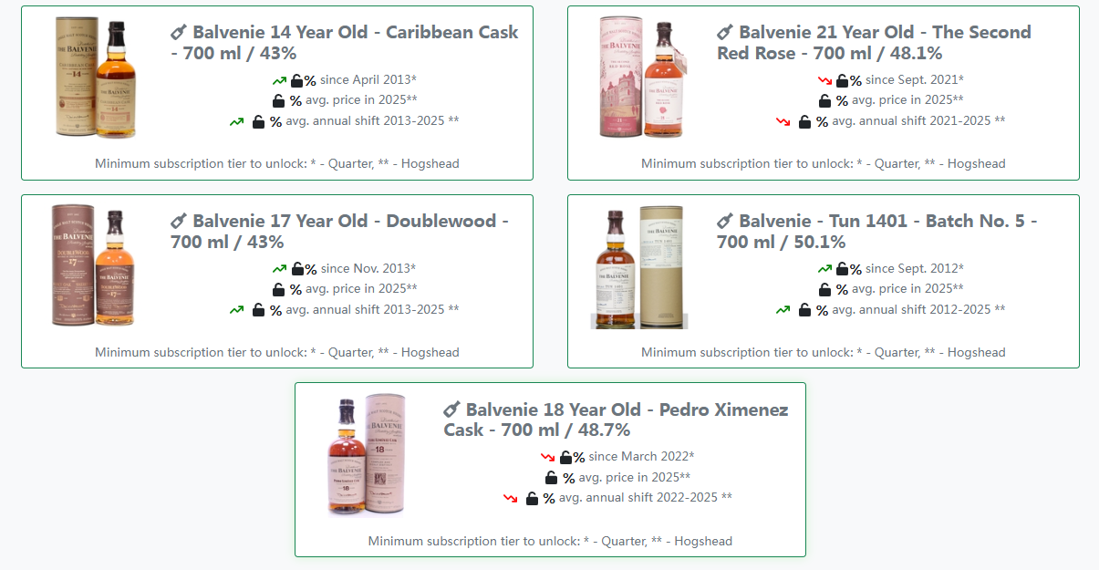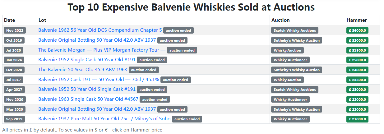 仍旧是著名威士忌分析网站whiskyhunter的统计,近些年在欧美各大拍卖行表现抢眼、价值突出的百富酒款如下——
