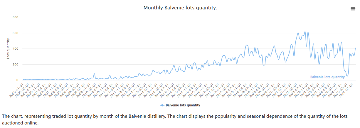 如下图,whiskyhunter统计了百富在欧美拍卖行的月度交易量走势,该数据于2022年多次达到高峰期(600+),此后在上上下下中曲折前行;今年3月份跌入谷底(48件),幸而下半年开启一波反弹,市场热情重燃——