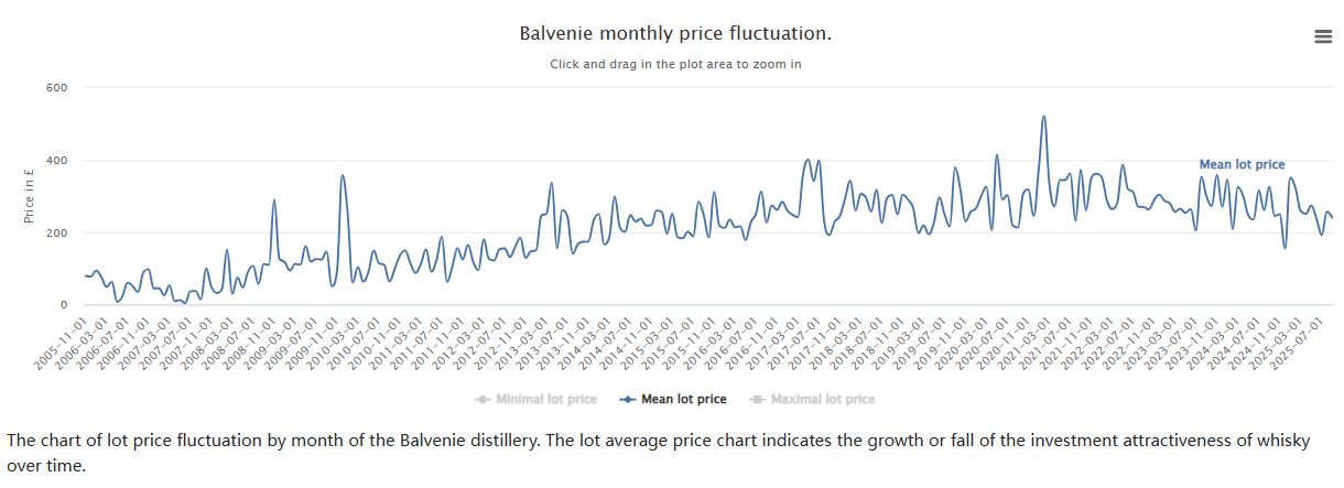 whiskyhunter统计了百富酒款在欧美拍卖行的月度均价走势,该数据于2021年2月达到巅峰期(约522英镑);此后一直在低于400镑的区间曲折前行;近两年虽有起伏,但整体水平保持相对稳定,价值坚挺如下图——