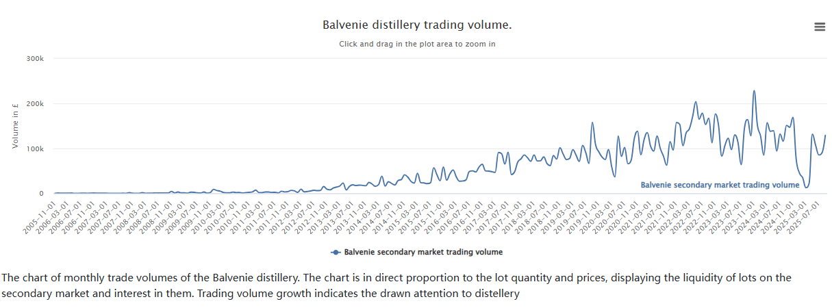 如下图,whiskyhunter统计了百富酒款在欧美拍卖行的月度交易额走势,该数据于2023年11月达到巅峰期(近23万英镑);今年3月份跌入谷底(勉强1.2万英镑),此后大幅反弹,市场信心进入修复期——