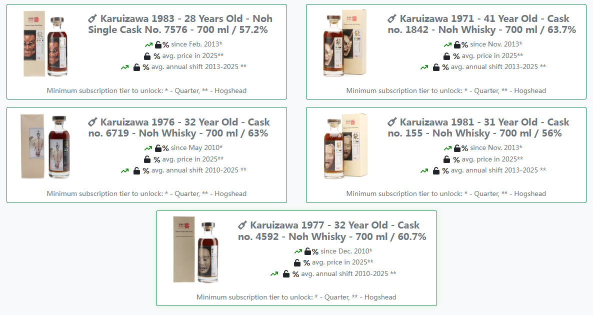 在whiskyhunter的网页上,根据珍稀度和价值潜力,罗列出了5支轻井泽潜力股。它们隶属不同的系列,各具珍稀价值魅力,藏家们可加以特别的留意,如下图——