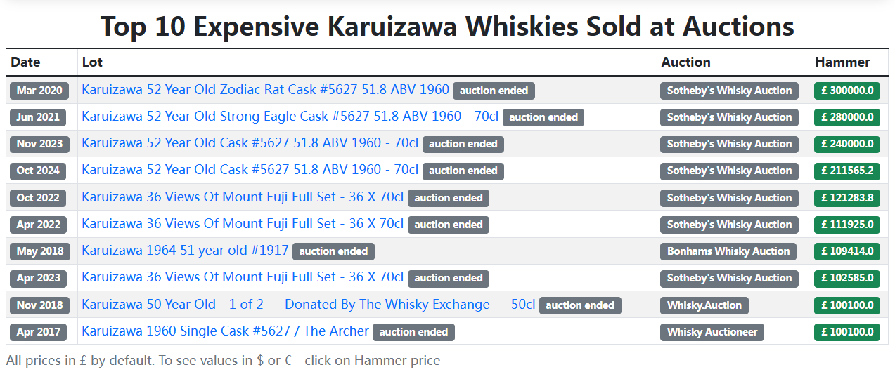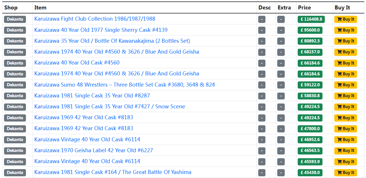 仍旧是著名威士忌分析网站whiskyhunter的统计,近些年在欧美各大拍卖行表现抢眼、价值突出的轻井泽酒款如下——