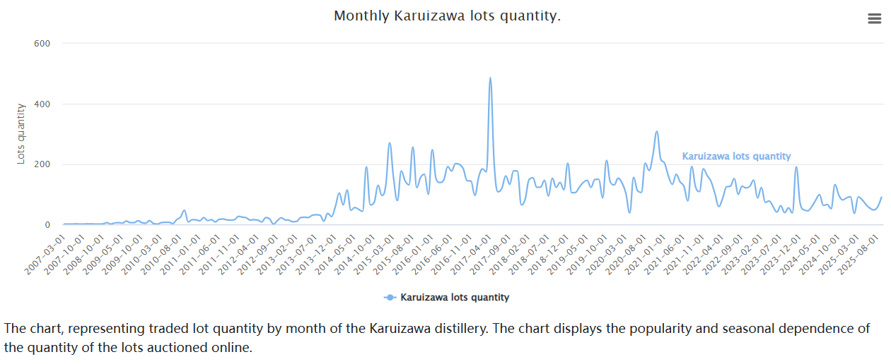 如下图,whiskyhunter统计了轻井泽在欧美拍卖行的月度交易量走势,该数据于2017年4月达到巅峰期(487件),此后在上上下下中曲折前行。整体交易量相较于其他名厂大酒可谓低调,这与其关厂停产不无关系——