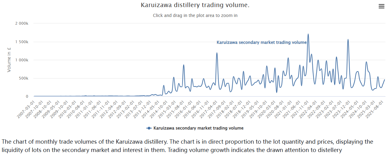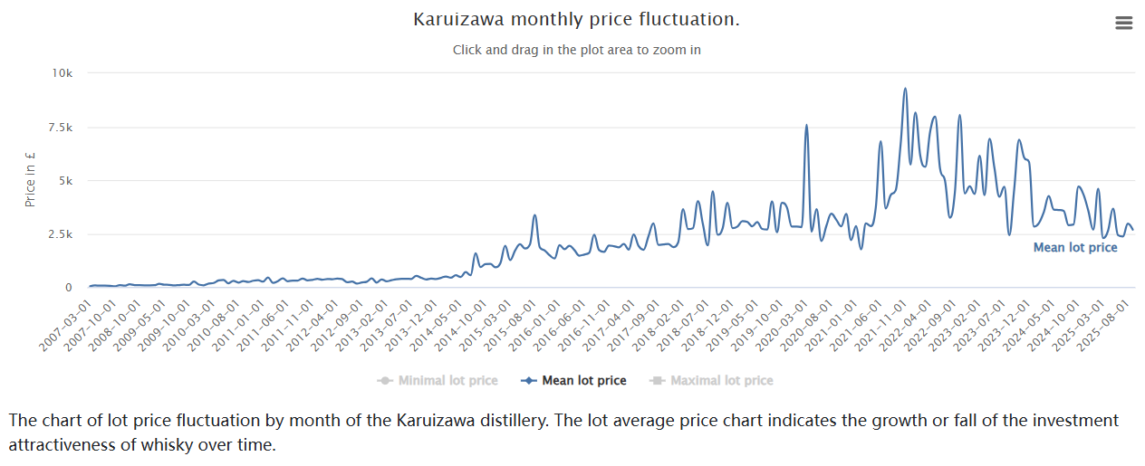 whiskyhunter统计了轻井泽酒款在欧美拍卖行的月度均价走势,该数据于2021年11月达到巅峰期(约9300英镑),远超全球各类大厂的水平,令人叹为观止;只可惜疫情至今起起伏伏,不断向低位试探;今年9月份欧拍均价仅为2680英镑,距高峰期跌幅超三分之二——