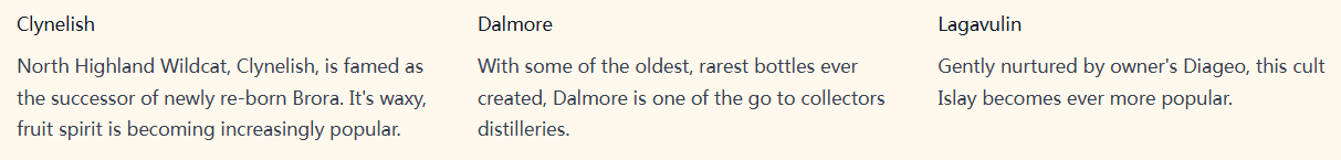 克里尼利基:Clynelish常被称为“北高地野猫”,作为Brora酒厂的继承者而闻名,其带有蜡质和水果风味的威士忌正越来越受欢迎。