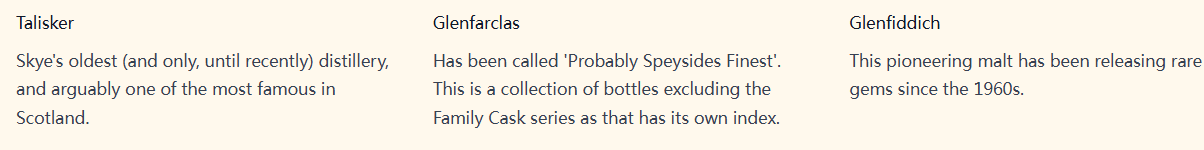 作为全面、权威的威士忌二级市场价值研究者,该平台擅长将酒款信息与威士忌评级、零售和二级市场价格观察联系起来,为爱好者、收藏家、投资者和专业人士提供有价值的见解。例如本文即将介绍的,Rare Whisky 101对于知名威士忌品牌的评语,非常独到且精彩,请跟随小编的笔触一探究竟吧~