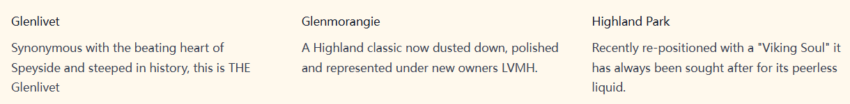 格兰杰:Glenmorangie是苏格兰高地经典的单一麦芽品牌,有着悠久的历史,被新东家LVMH收购后,更是焕发出全新的活力。
