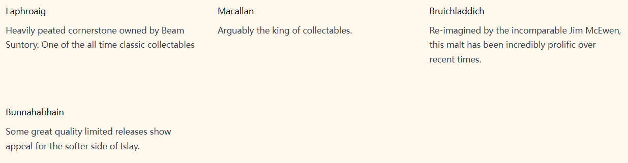 布赫拉迪:由无与伦比的酿酒大师Jim McEwen重新引航出发,这款单一麦芽品牌近些年的产品线非常丰富多彩。