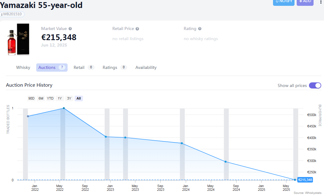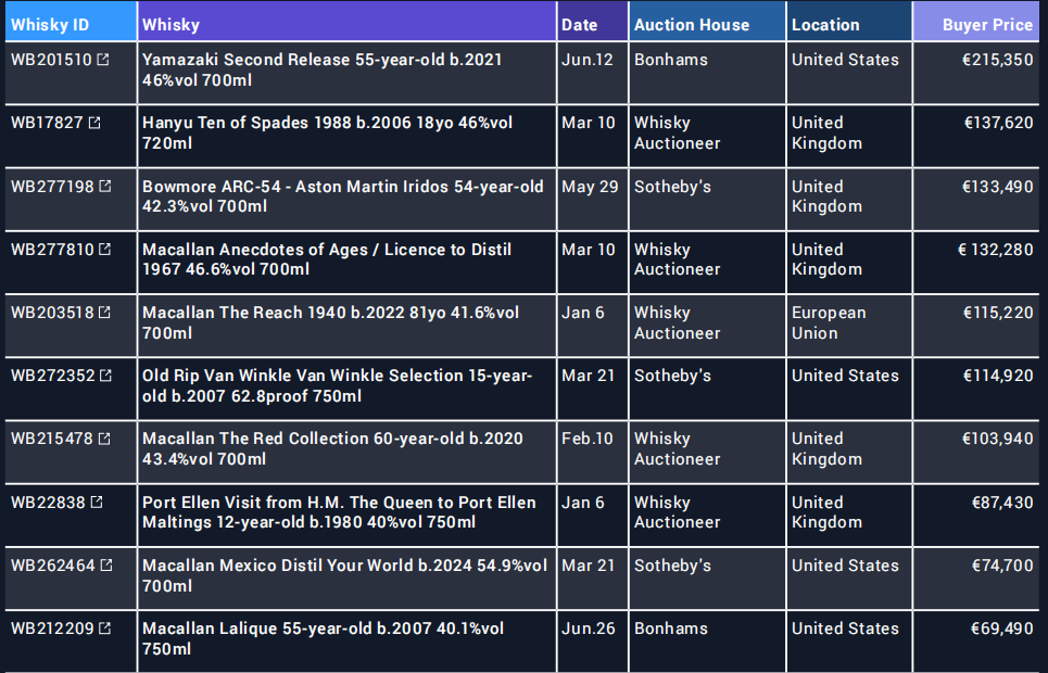 2025年上半年,各类高价值威士忌在拍卖会上频繁易主。6月12日,山崎 55年第二版(Whiskystats编号 WB201510)在美国bonhams拍卖行以21.535万欧元落槌,是为上半年成交价最高纪录。这一榜首价格延续了日本威士忌自2024年第三、四季度以来的趋势——彼时日威同样在最高成交价交易中占据主导地位。