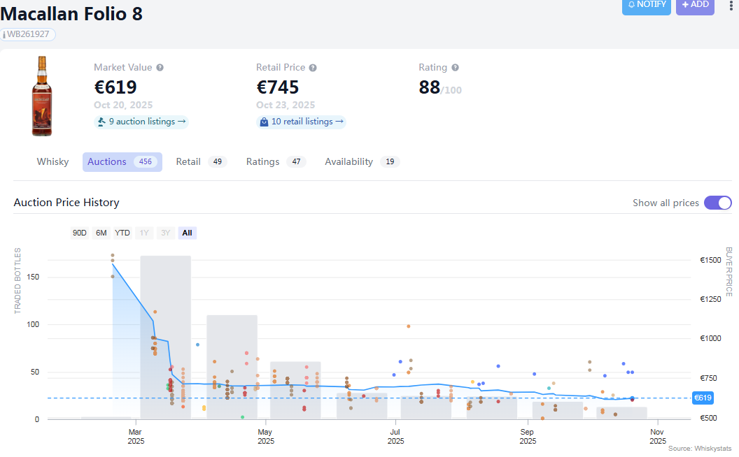 麦卡伦同样表现突出,其“和谐系列”(Harmony Collection)的多支酒款,以及新推出的“档案系列”(Archival Series)均跻身交易量最高的酒款榜单。其中,麦卡伦档案系列第8册(编号 WB261927)的市场动态,完美契合了该酒厂“高定位无年份(NAS)、未知装瓶量”高端酒款的典型特征——