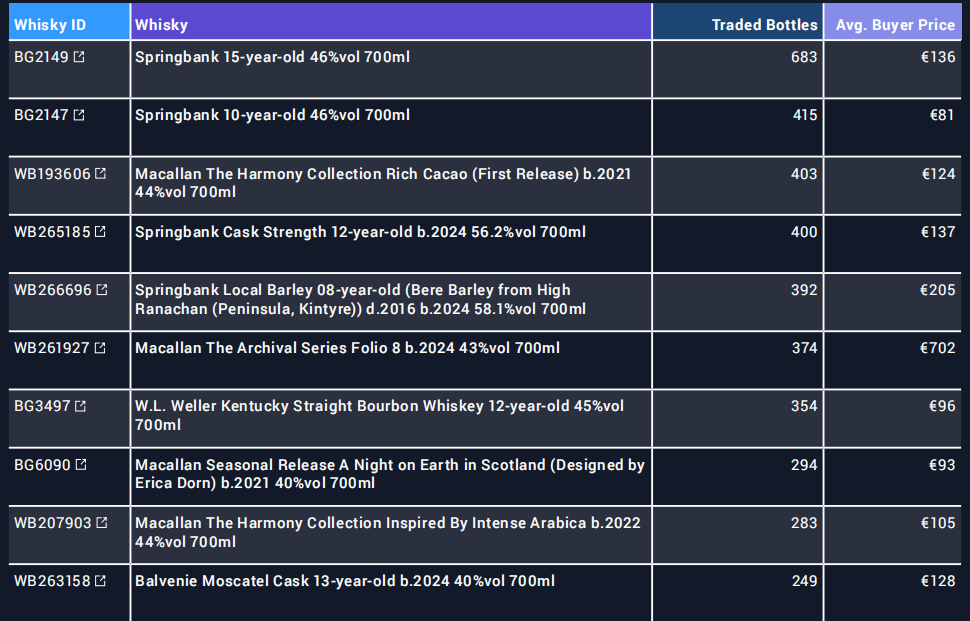 云顶(Springbank)在交易量方面持续表现强劲,其中云顶15年(编号 BG2149)与云顶10年(编号 BG2147)两款酒引领交易热潮,成为交易量最高的威士忌。这两款酒的销量始终保持高位,反映出它们在藏家与饮家群体中拥有广泛人气。