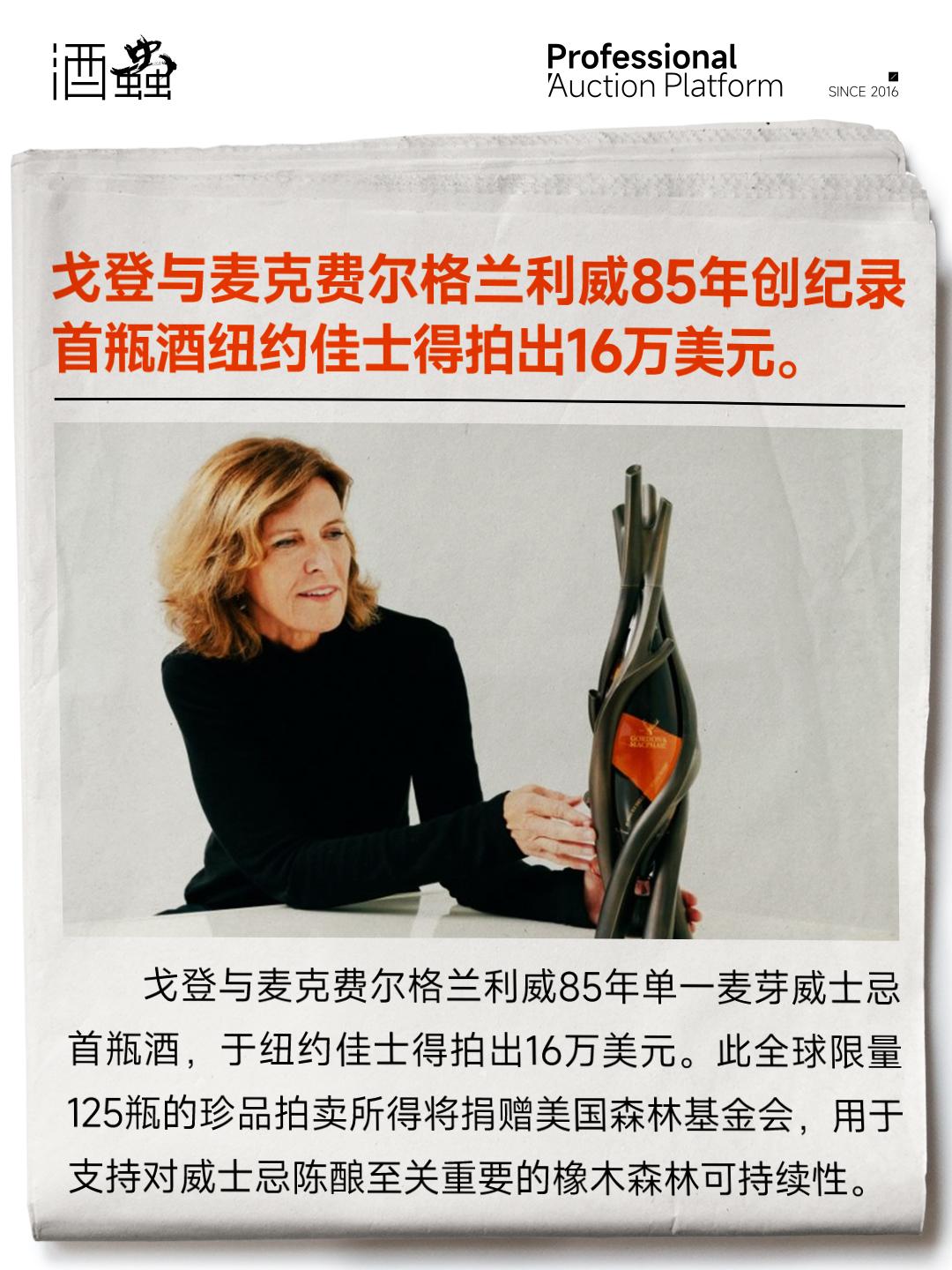 戈登与麦克费尔格兰利威85年创拍卖纪录。11月21日,纽约佳士得拍卖会上,古老的苏格兰单一麦芽威士忌——格兰利威85年陈酿首瓶酒以16万美元成交,含费用超过20万美元。