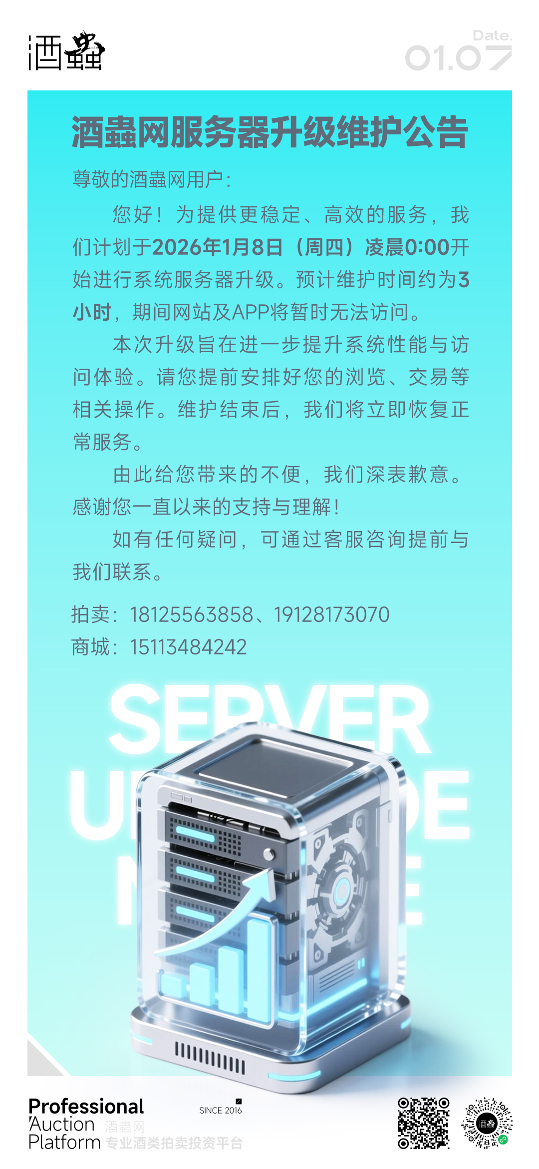 公告!酒蟲网服务器将于1月8日(周四)0:00 升级