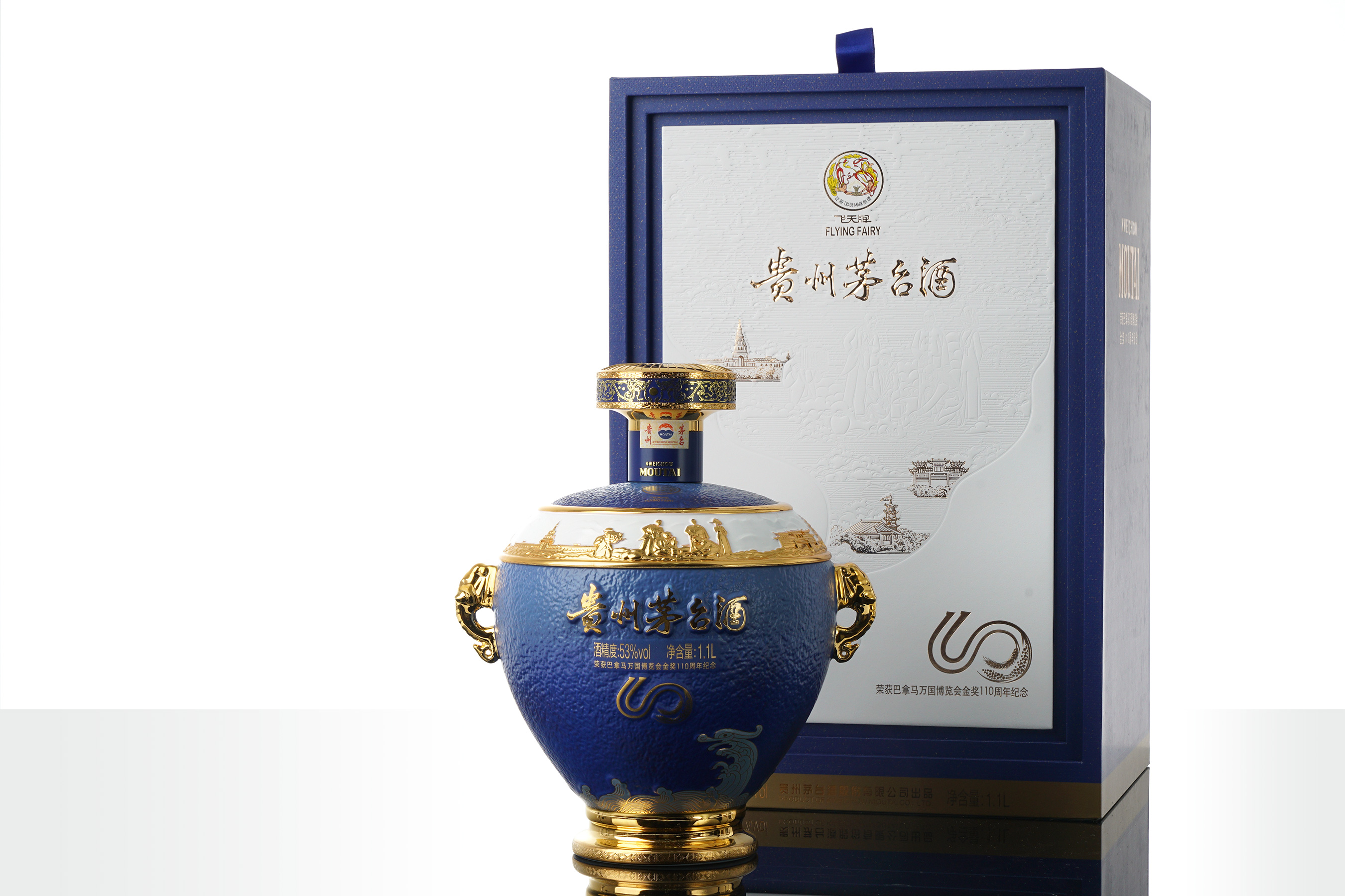 纪念酒外盒以典雅青金石色为基调,在中国传统中又称“帝青色”,寓意尊贵、智慧与永恒。盒面以艺术浮雕与彩绘工艺,呈现茅台参与国际展览的历史片段,致敬其走向世界的历程。并融汇中西建筑元素,象征茅台在东西方文化交融中走向世界。
