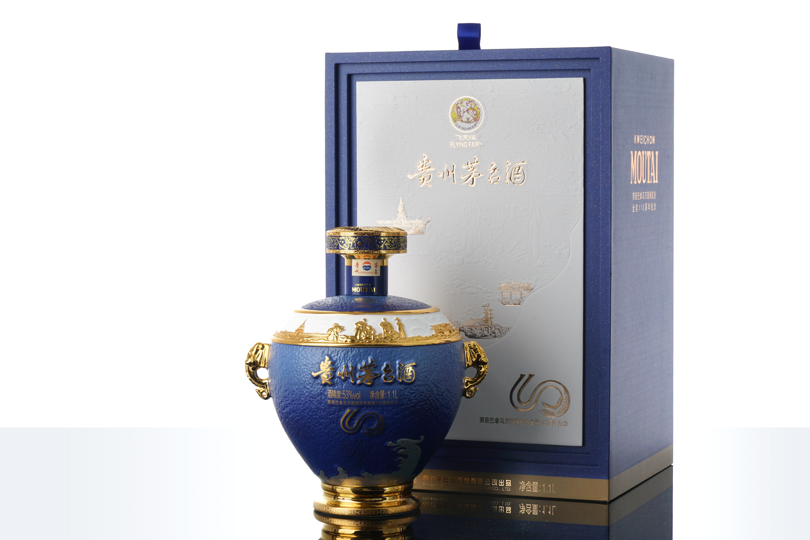 纪念酒外盒以典雅青金石色为基调,在中国传统中又称“帝青色”,寓意尊贵、智慧与永恒。盒面以艺术浮雕与彩绘工艺,再现茅台“摔瓶夺金”的历史场景,并融汇中西建筑元素,象征茅台在东西方文化交融中走向世界。