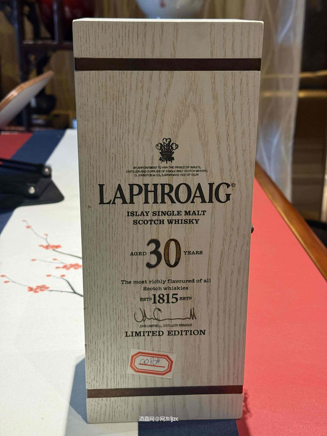这瓶是拉弗格(Laphroaig)30年 限量版(由酒厂经理 John Campbell 签名的白标木盒版本),属于艾雷岛威士忌中的顶级旗舰款,核心信息如下: • 陈酿年份:30年 • 酒精度:53.5%(原桶强度,非冷凝过滤) • 包装:标志性白色钢琴烤漆木盒,内含收藏证书与品鉴手册 • 地位:拉弗格高年份核心旗舰,停产多年,是泥煤威士忌收藏的“硬通货”。